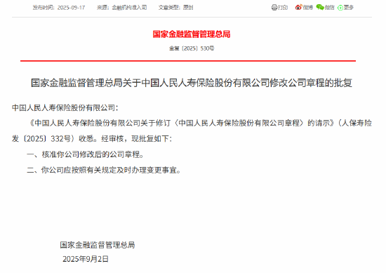 9月17日金融一线消息,国家金融监督管理总局今日发布关于中国人民人寿保险股份有限公司修改公司章程的批复每日配资平台,核准中国人民人寿保险股份有限公司修改后的公司章程。